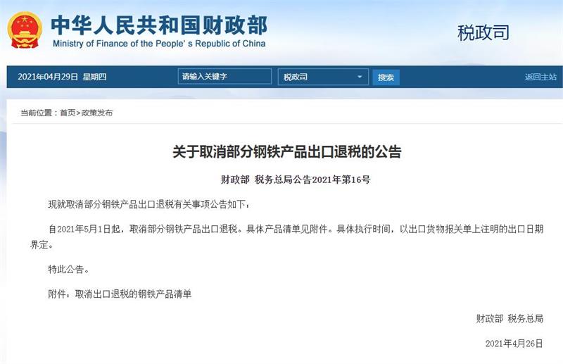 另外,財政部、國家稅務(wù)總局聯(lián)合發(fā)布公告,自2021年5月1日起,取消部分鋼鐵產(chǎn)品出口退稅。具體執(zhí)行時間,以出口貨物報關(guān)單上注明的出口日期界定。