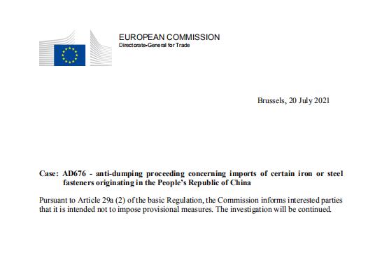 歐盟對(duì)原產(chǎn)自中國(guó)的鋼鐵制緊固件產(chǎn)品反傾銷案最新進(jìn)展:不實(shí)施臨時(shí)反傾銷措施