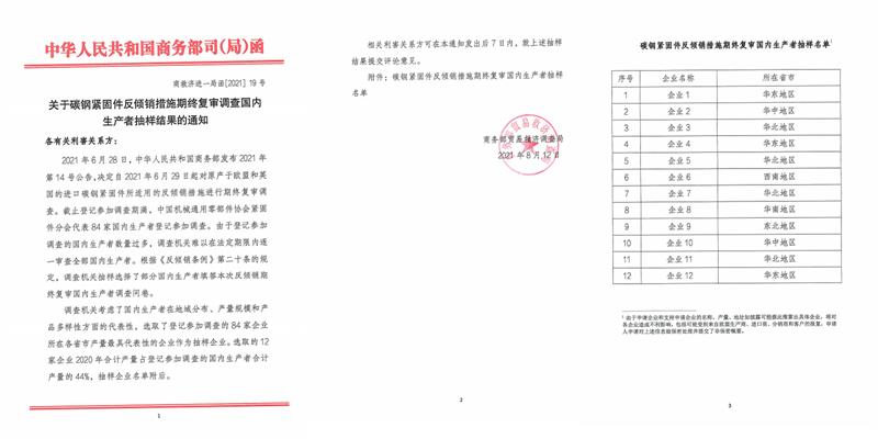 關(guān)于碳鋼緊固件反傾銷期終復(fù)審調(diào)查國(guó)內(nèi)生產(chǎn)者抽樣結(jié)果的通知