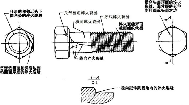 產(chǎn)生原因:在熱處理過程中,由于過高的熱應(yīng)力和應(yīng)變,都可能產(chǎn)生淬火裂縫。淬火裂縫通常是不規(guī)則相交、無規(guī)律方向的呈現(xiàn)在緊固件表面。