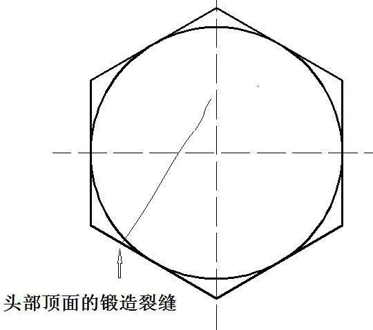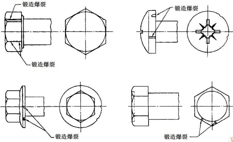 產(chǎn)生原因:鍛造裂縫可能在切料或鍛造工序中產(chǎn)生,并位于螺栓和螺釘?shù)念^部頂面,以及凹穴頭部隆起部分。