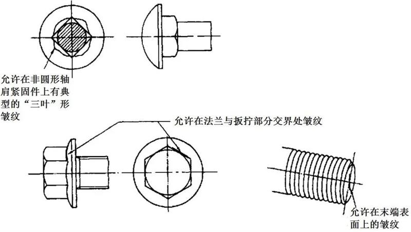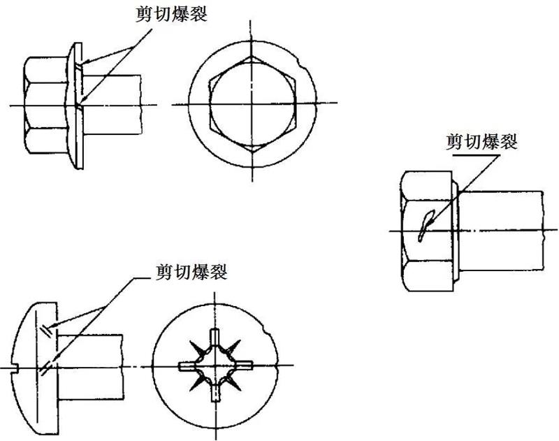 六角頭及六角法蘭面螺栓和螺釘:六角法蘭面螺栓和螺釘?shù)姆ㄌm面上的剪切爆裂,不應(yīng)延伸到頭部頂面的頂圓(倒角圓)或頭下支承面內(nèi)。對角上的剪切爆裂,不應(yīng)使對角寬度減小到低于規(guī)定的最小尺寸。
