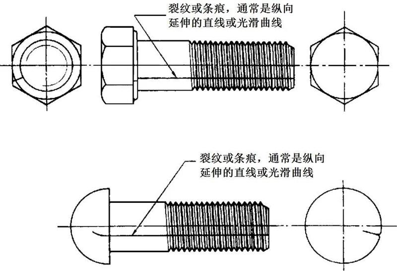 檢測要求:裂紋或條痕的深度:≤0.03d。如果裂紋或條痕延伸到頭部,則不應(yīng)超出對鍛造爆裂規(guī)定的寬度和深度的允許極限,d為螺紋公稱直徑