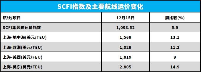 商船改道好望角,最直觀的影響就是行距拉長,且加上巴拿馬運河干旱限航以及航運公司抽船減班。據(jù)相關(guān)航運數(shù)據(jù),中國至歐洲航線運價已經(jīng)連續(xù)大漲,漲幅之大創(chuàng)下今年記錄。其中,12月15日,上海港出口至歐洲基本港市場運價(海運及海運附加費)為1029美元/TEU,較上期上漲11.2%;上海港出口至地中海基本港市場運價(海運及海運附加費)為1569美元/TEU,較上期上漲13.1%。