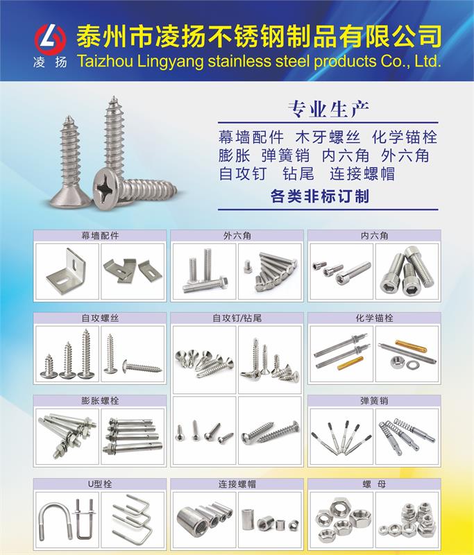 主營業(yè)務:幕墻配件、木牙螺絲、化學錨栓膨脹、彈簧銷、內六角、外六角、自攻釘、鉆尾、連接螺帽及各類非標訂制。