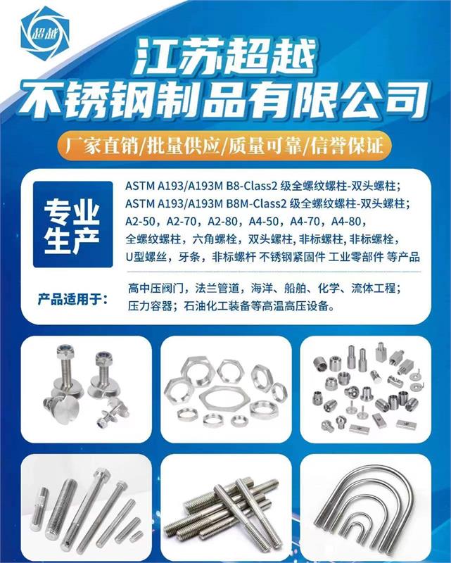 據(jù)公司總經理趙克松介紹,江蘇超越專業(yè)生產不銹鋼、全螺紋螺柱、化工螺柱、雙頭U型絲、非標螺桿、牙條等緊固件產品,產品主要適用于高中壓閥門、法蘭管道、海洋船舶配件、化學工程、壓力容器等。